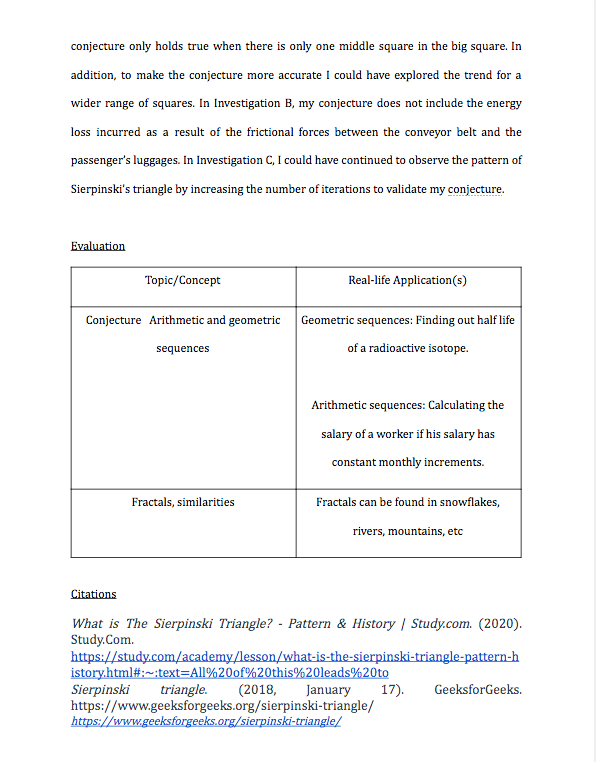 Fractals play an integral part in our everyday lives, unbeknownst to some of us. For example, fractals are used to predict or analyse various biological processes or phenomena such as the growth pattern of bacteria, the pattern of situations such as nerve dendrites, etc. Fractals also depict the beauty of nature, such as snowflakes, mountain ranges, and even the terrifying electrical powers of lightning is an amazing real life application of fractals. In the process of completing this blogpost urged me to think out of the box, be creative; be innovative; and be more cognitive of my surroundings and everyday life. I have thus learnt the IB learner profiles of being a thinker, as it is paramount to equip oneself with the skills of thinking out of the box and applying critical thinking; being open-minded as there is an infinite trove of knowledge only waiting to be discovered; being knowledgeable, keep exploring, keep striving, keep on achieving greater heights.